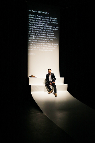 Der Regisseur Karim Chérif bringt nun den Text als experimentelle Reflexion des globalisierten Nebeneinanders von Alltag und Extremsituation auf die Bühne und untersucht die Selbstrepräsentation im digitalen Raum als Überlebensstrategie.